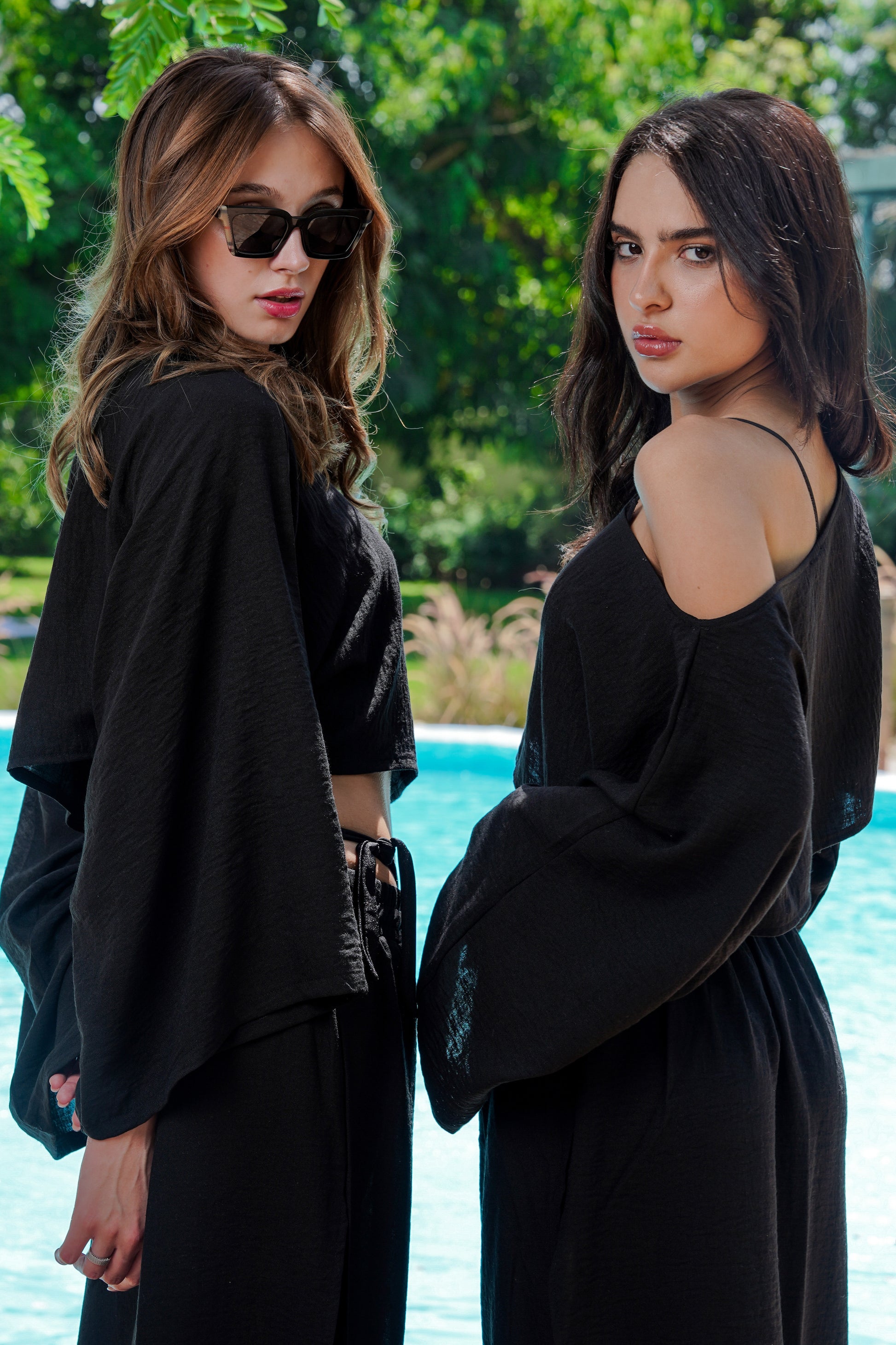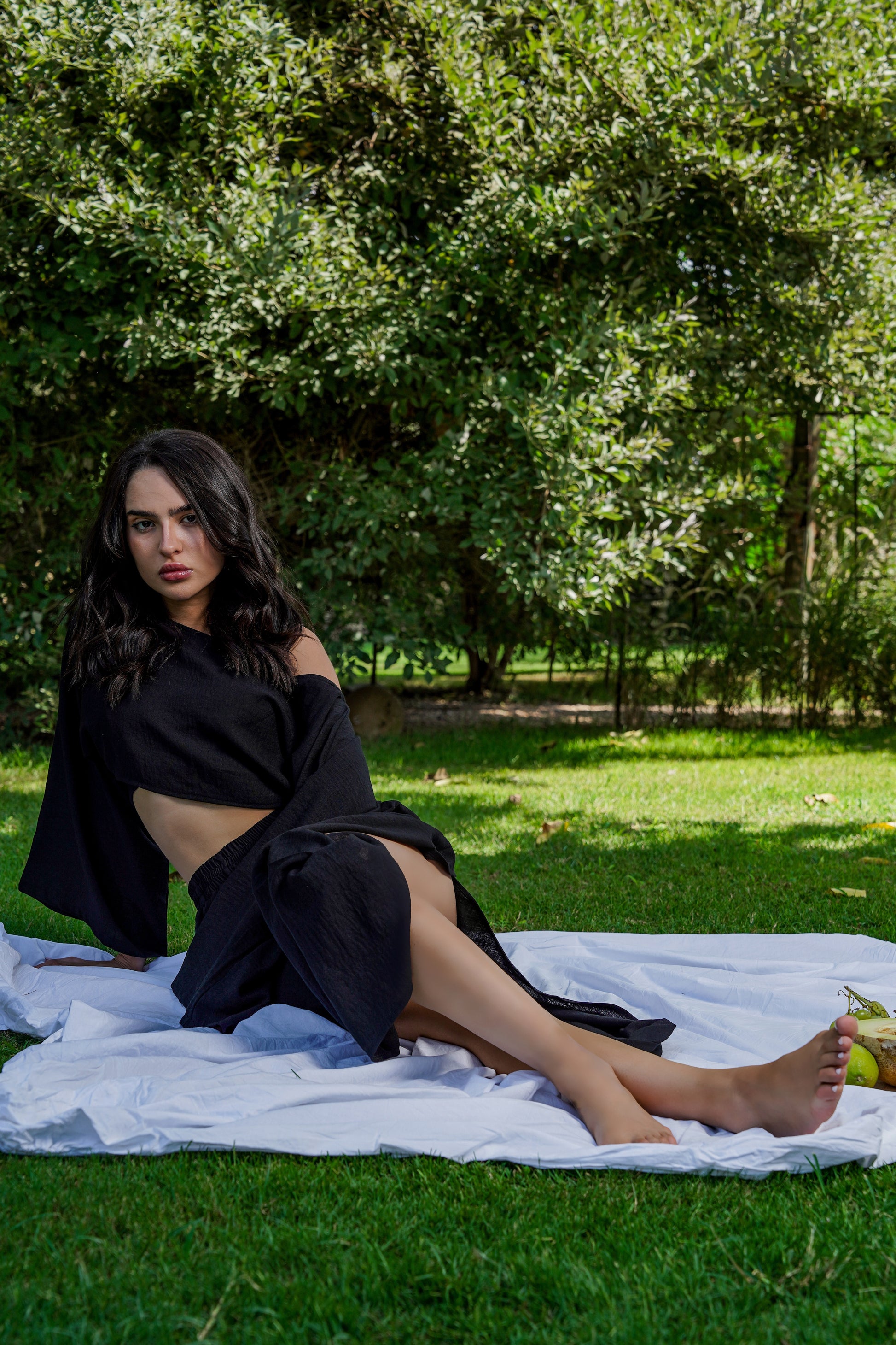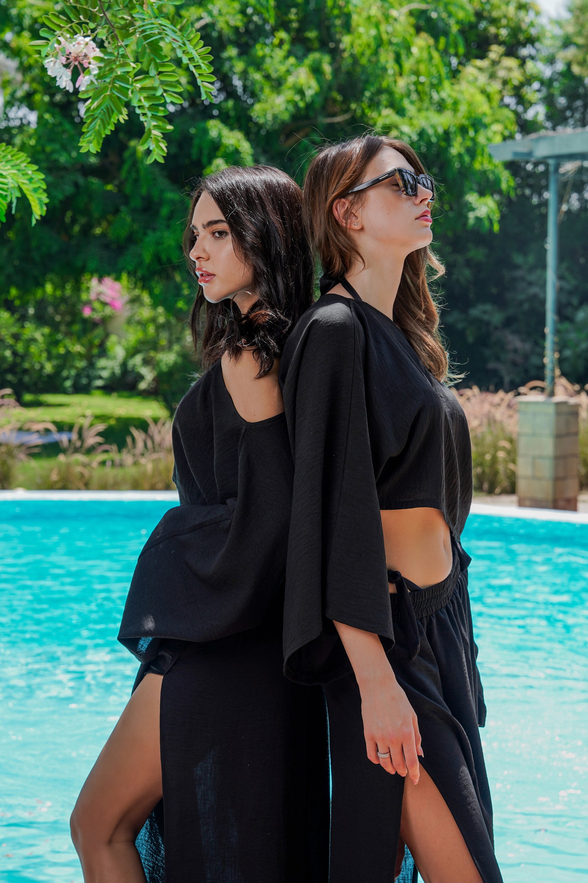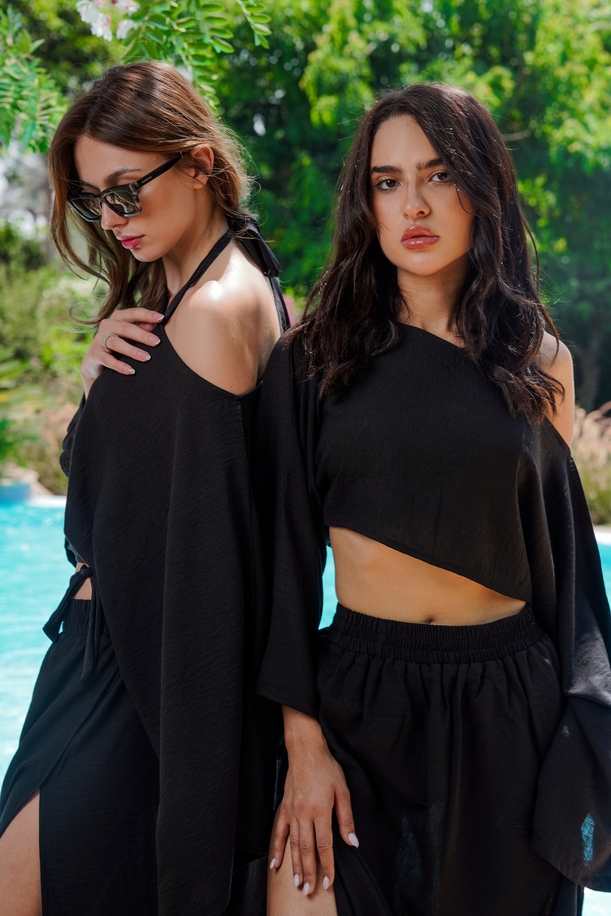 Paired with the top is a flowy skirt, designed with open sides that create graceful movement with every step. Its black hue enhances its versatility, allowing it to transition seamlessly from casual outings to evening gatherings. Together, this ensemble embodies sophistication and comfort, making it a must-have for your summer wardrobe.